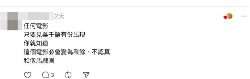 有网友声称:只要是有吴千语参演的电影,你就知道这片子肯定会变得业余、敷衍,跟马戏团表演似的!