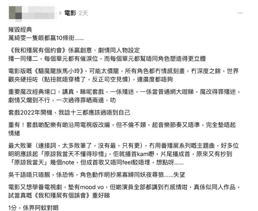 由艺人万绮雯、尹天照及张文慈等主演的亚视神剧《我和僵尸有个约会》曾被视为经典之作!如今电影版《驱魔龙族马小玲》上线内地平台,口碑却大逆转,网民狠批“炒冷饭烂片”,首日收入仅55万人民币!